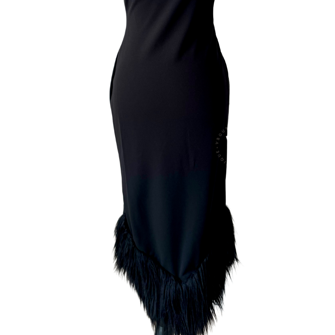Vestido negro ceñido al cuerpo en corte midi con forma asimétrica en el busto y unión de tirantes ajustables en espalda. La tela es stretch, no tiene cierre. Cuenta con detalle de faux fur en la terminación de la parte baja.